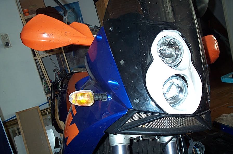 Na enkele ritten in het donker had ik ernstige behoefte aan iets pittigers qua licht. Ik ben er inmiddels achter dat een Xenon peer in een originele KTM-lampunit wel veel licht brengt maar ook veel verblinding van tegenliggers, ze passen namelijk niet goed genoeg bij elkaar. Dat geldt dan voor het "dimlicht", onder dus. Xenon schijnt zo´n goede lichtbron te zijn dat het probleem vooral is hoe je al dat licht goed op de weg brengt. Een Hella Xenon unit kost enorm veel, een goed alternatief kan zijn twee mooie Halogeenlampen met wat meer wattage. Een Hellalamp zou daar tegen moeten kunnen, in tegenstelling tot de KTM reflector die gaat smelten...