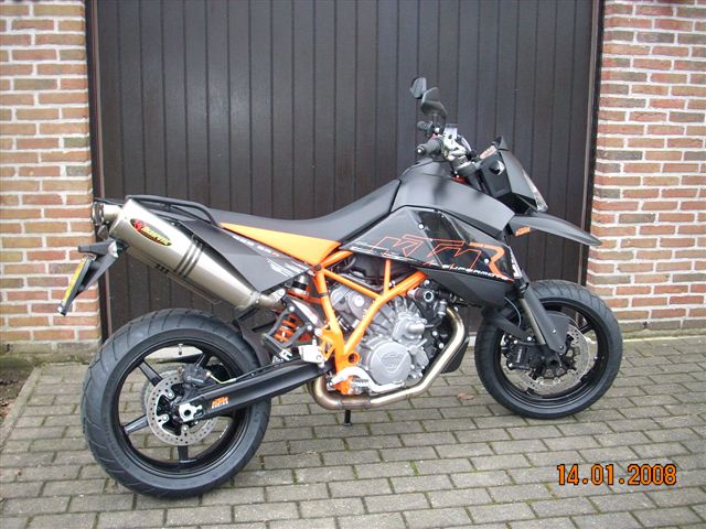 Hoi, Bompie. Ik heb mijn uit Duitsland geimporteerde KTM 950 SMR wegens omstandigheden pas afgelopen week op kunnen bouwen ( tank van de spuiter, aanpassen carburateurs, 16 tands-voortandwiel en aanpassen luchtfilterdeksels). Ik had er na mijn rit terug uit Munchen in de sneeuw en gladheid, niet meer op gereden en ben van de week even een stukje gaan rijden. Wat geeft deze motor toch een hoop plezier ( daar heb ik mijn 185 pk van mijn vorige motor, Suzuki GSXR 1000 K5 niet voor nodig).