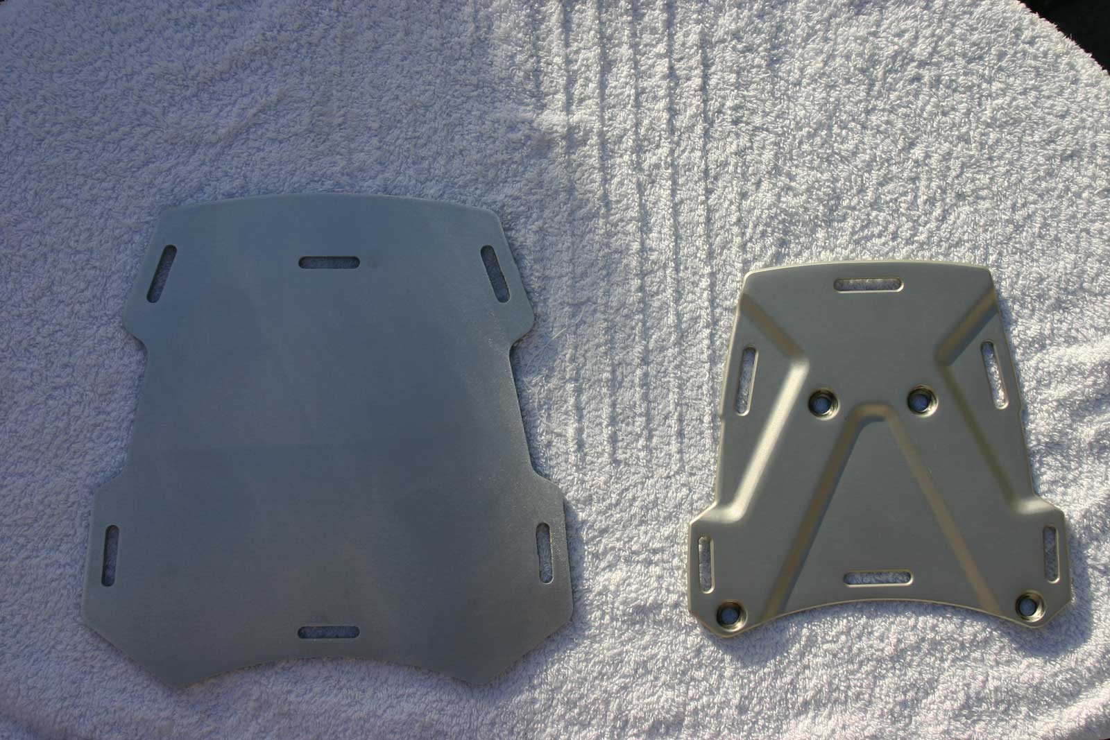 Om een Givi koffer als topkoffer te kunnen gebruiken had ik al eens, uit RVS, een vervangend plaatje laten lasersnijden. Functioneert prima maar bleek wel wat zwaar. Daarom, heb ik nu een aantal plaatjes uit 6 mm aluminium laten maken (in dit geval zijn ze met een waterstraal gesneden).