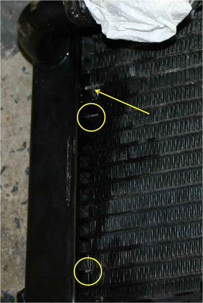 pijltje is waar het lek is, circeltjes zijn andere beschadigingen door de ventilator behuizing. Ik kan me moeilijk voorstellen dat dit door de klap is. Lijkt me meer langzaam ingesleten door trillen.