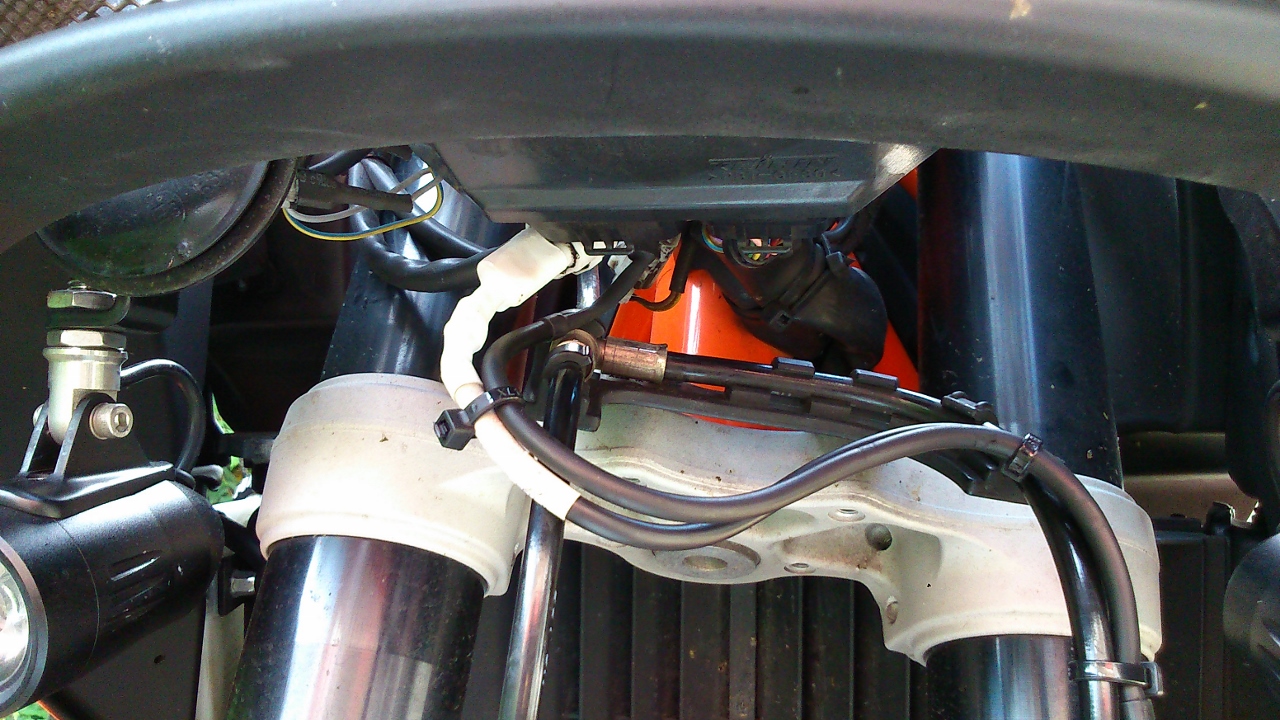 Ben zelf maar aan de slag gaan met m'n soldeerbout. Herkennen jullie dit probleem? Ik denk dat de dealer de bedrading te strak heeft vastgezet met tie ribs en door het draaien van het stuur de draad geheel gebroken is, zie foto.