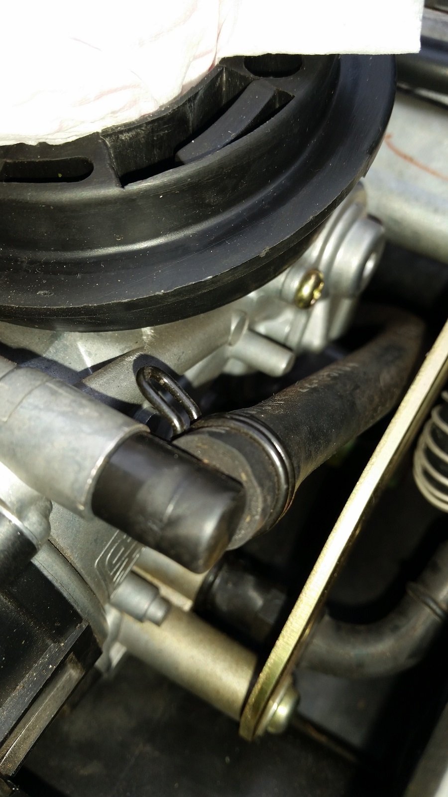 klopt, daar waar de spiraalveer omheen zit is de benzineslang. 1 naar elke carb. vanaf een t-stuk(bij mijn SE tenminste)