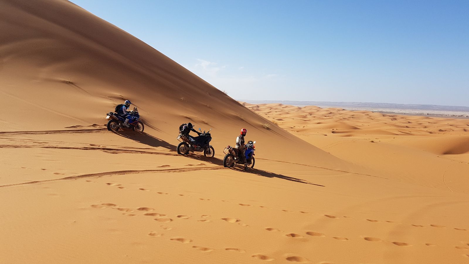 De mannen hebben het gehaald na een nachtje city hoppen en zijn de motoren aan het uitpakken. Een stressvol begin maar volgende we hier een foto van 4 lc8en boven op een zandduin!