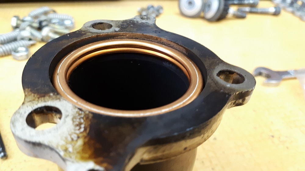 Het probleem: het pijpje schuift te ver over de rand van de uitlaatmond van het Y-stuk. De rand van die uitlaatmond is immers maar een 3mm dik, terwijl het pijpje er zo'n 6mm kan overschuiven. Je mag de bouten waarmee je dit pijpje vast schroeft aan de flens van de uitlaatmond nog zo hard aantrekken als je wilt, het is gewoon onmogelijk om dat strak te krijgen.