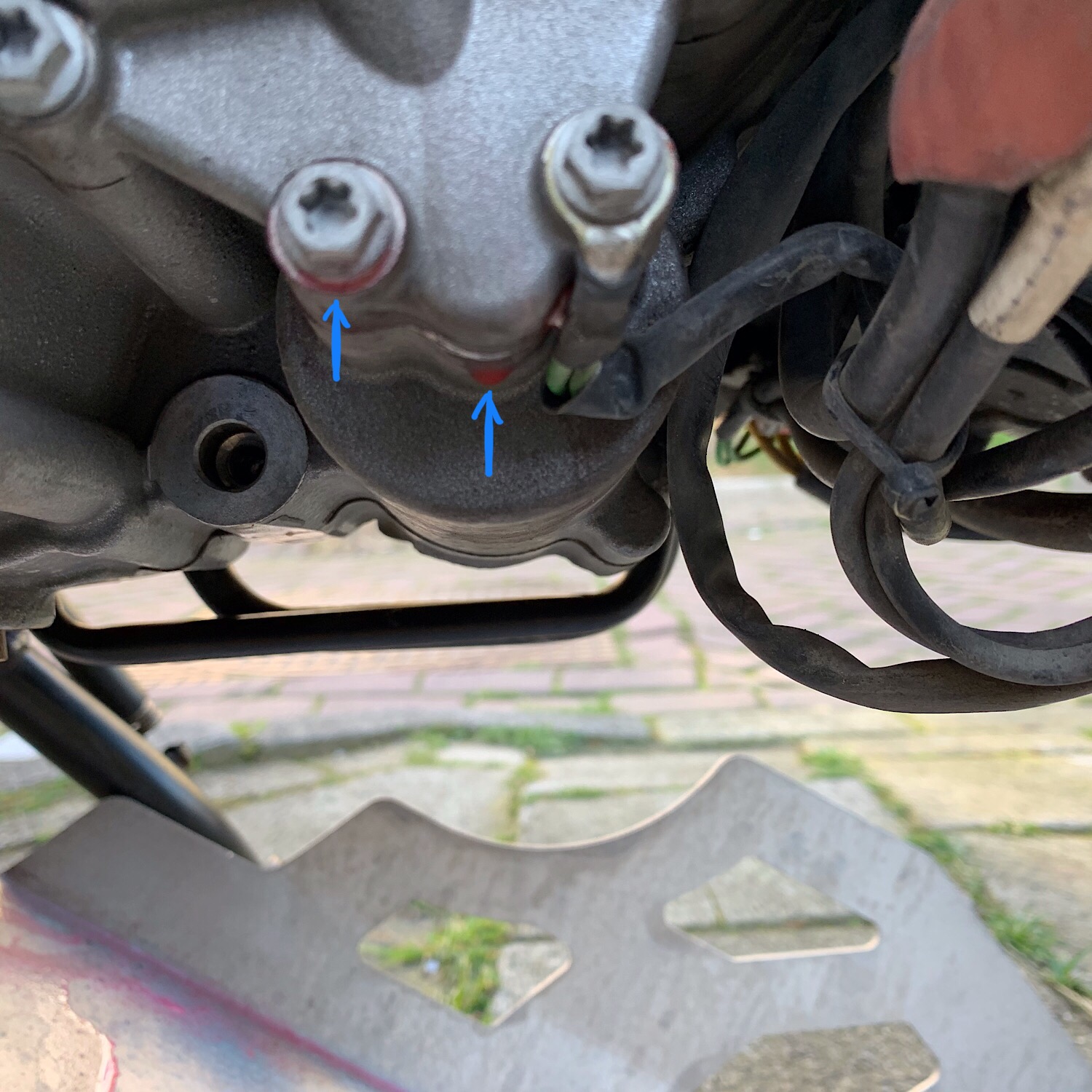 Een paar weken geleden de 990 Adv uit ‘09 uit de stalling gehaald. Na het manoeuvreren zag ik een druppeltje koelvloeistof op de vloer liggen. Na verdere inspectie bleek er redelijk wat KV op de bashplate te liggen. Er hing een druppeltje KV onder aan het blok maar ik zag geen sporen vanaf de waterpomp. Ik heb de boel schoon gemaakt maar zag daarna niks meer. Ook niet tijdens of na een rit. Eind vorig seizoen had ik precies hetzelfde. Ik zag wat KV, maakte de boel schoon en daarna niks meer tot na de winterstop.