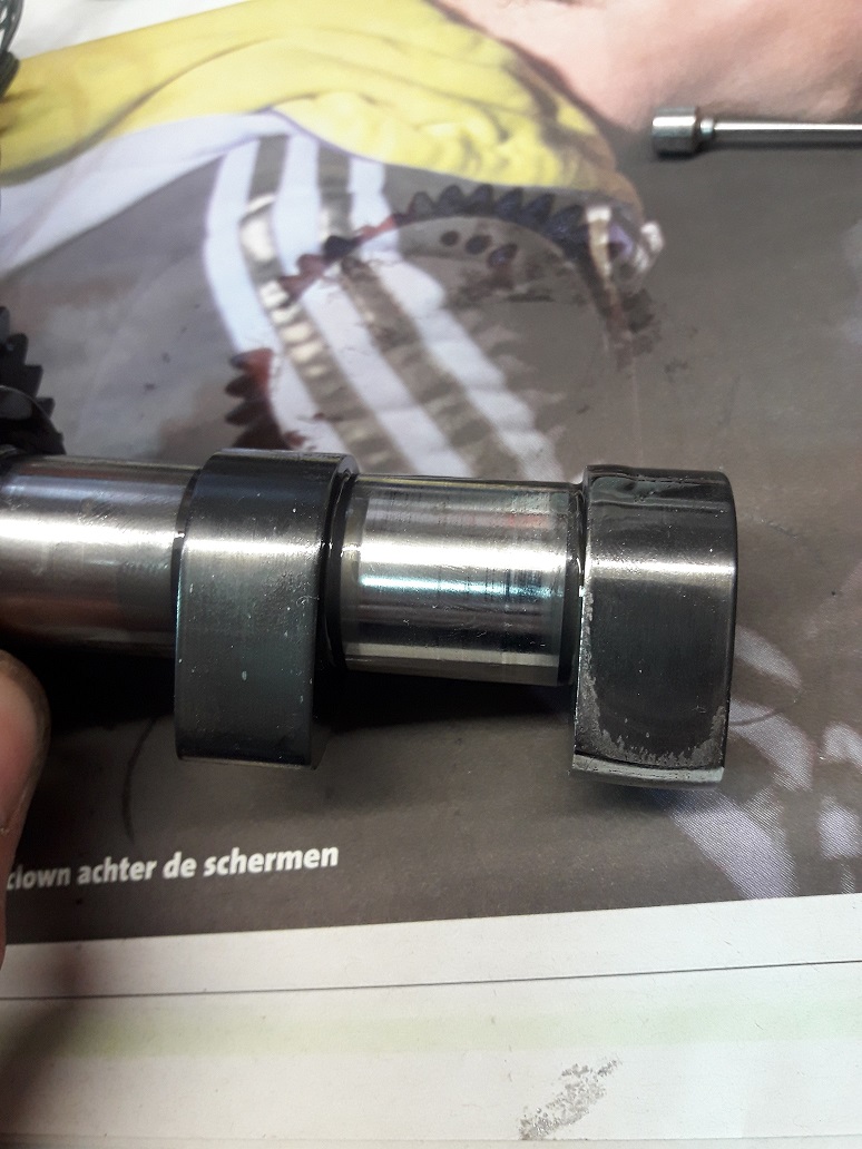 Voorste cilinder, rechter inlaat nok van de nokkenas, is gesleten, flink stuk eraf en klepstoter is ingedeukt.