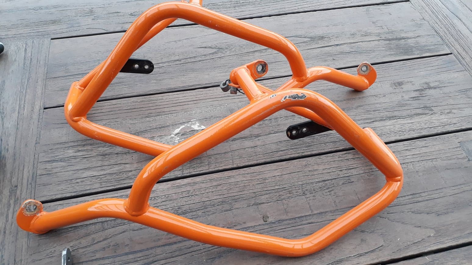 Zijn dat de OEM KTM kofferbeugels? Dus waarin de Hepco&Becker-koffers klikken? Is enkel de lak beschadigd of het nogal krom en scheef?