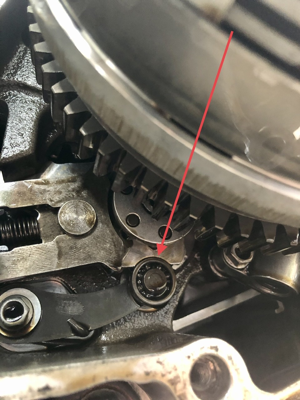 Ik begreep dat de pinnen in die schijf waar de schakelas in grijpt soms er uit lopen wat ditzelfde probleem kan geven, maar dat was het niet. Toevallig had ik wel hetzelfde probleem toen het open lag dus kon ik er een foto van maken.