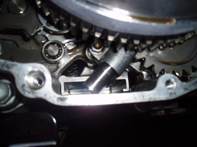 Daarna de koppelingskorf gedemonteerd. Doe dat overigens niet zonder dat stukje van het werkplaatshandboek te hebben gelezen, want het is echt kei-simpel dan.....en zie daar...het druk-gedeelte van de oliepomp, met daarvoor een tandwiel. Voor de duidelijkheid...na wat research op ADVRIDER heb ik besloten dat hele gedeelte van de pomp te vervangen, dus niet alleen de veer en de piston, maar alles. Kosten 24euro!!