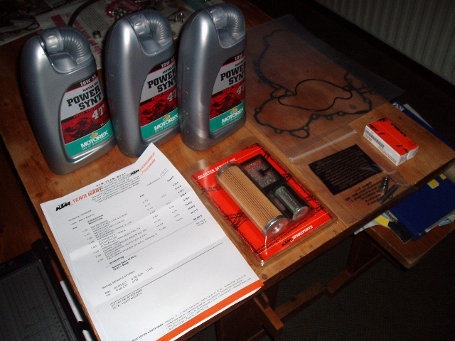 Nou, het begin is gemaakt. Aangezien ik vandag een vrije dag had, en geen zin had om te wachten op MCV maar even op en neer gereden richting Oberhausen (KTM team-west). Mooi, daar hadden ze dus alle spulletjes op voorraad tegen een schappelijke prijs. Al het spul op de foto voor 100 euro: bougies, veer dumpvalve, dumpvalve, circlip, oliefilterkit, koppelingshuispakking, waterpomppakking en niet te vergeten 3 liter olie van Motorex. (10W50).