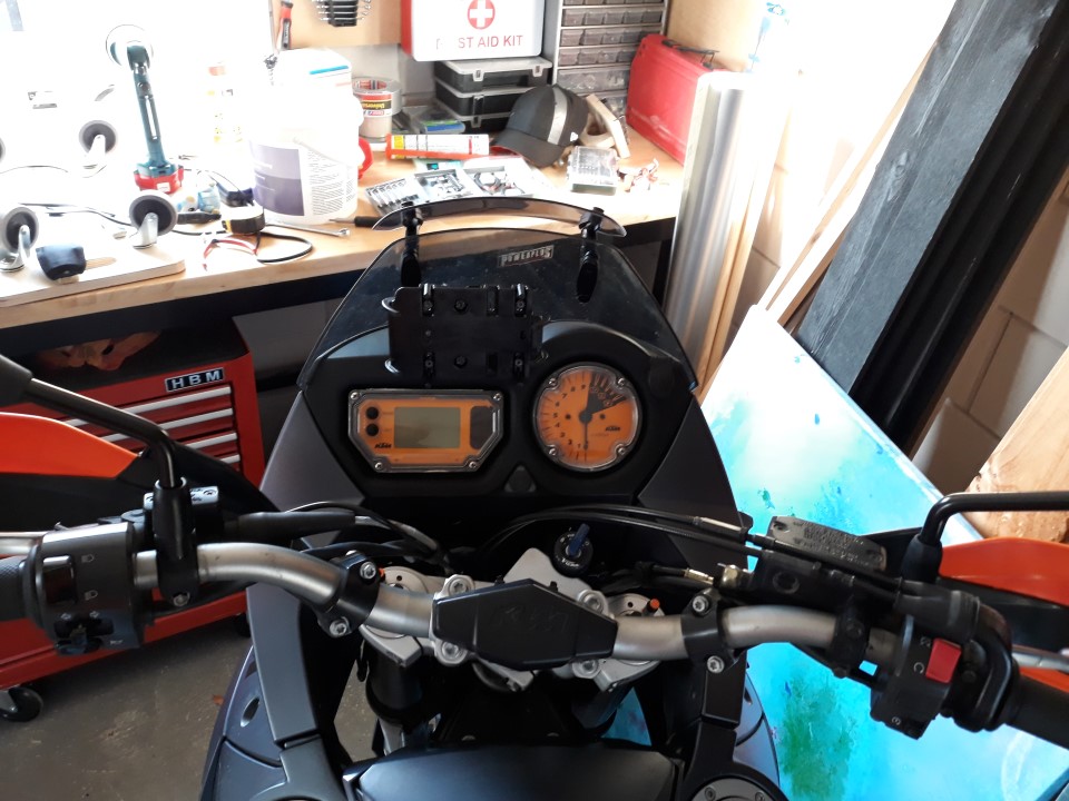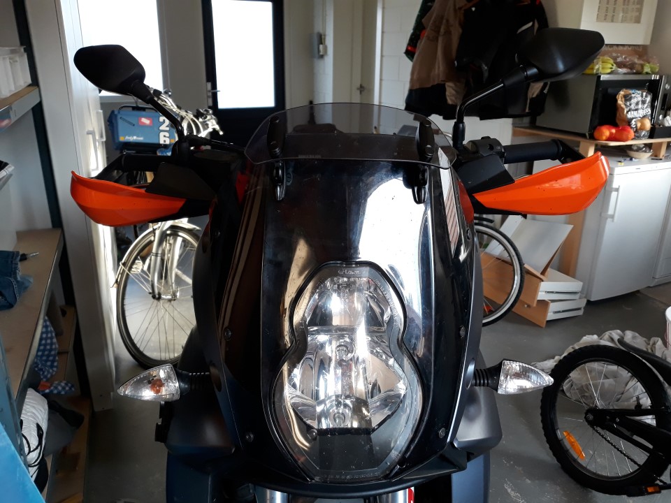 Nu had hij zijn Touratech opzetruitje over, dit is één voor een GS dus breder dan het originele scherm van mijn KTM, wonderwel, veel minder gebulder, kan met mijn Shubert C3 systeemhelm tot 120 KM/U open rijden.