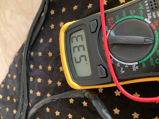 - multimeter op het eerste metalen plaatje in de stekker geeft 533 als resultaat;