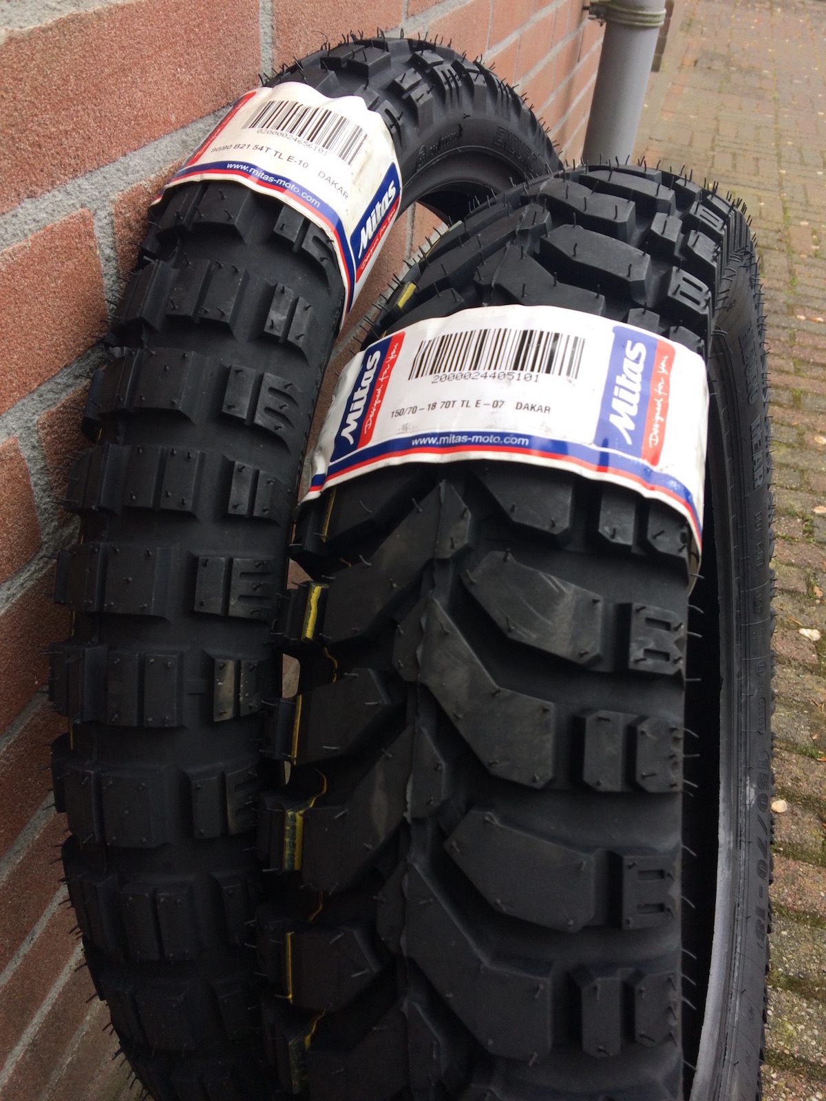 De standaard banden eraf en een Mitas E-10 Dakar 90/90-B21 voor en achter een Mitas E-07 Dakar 150/70-18 erop gezet.
