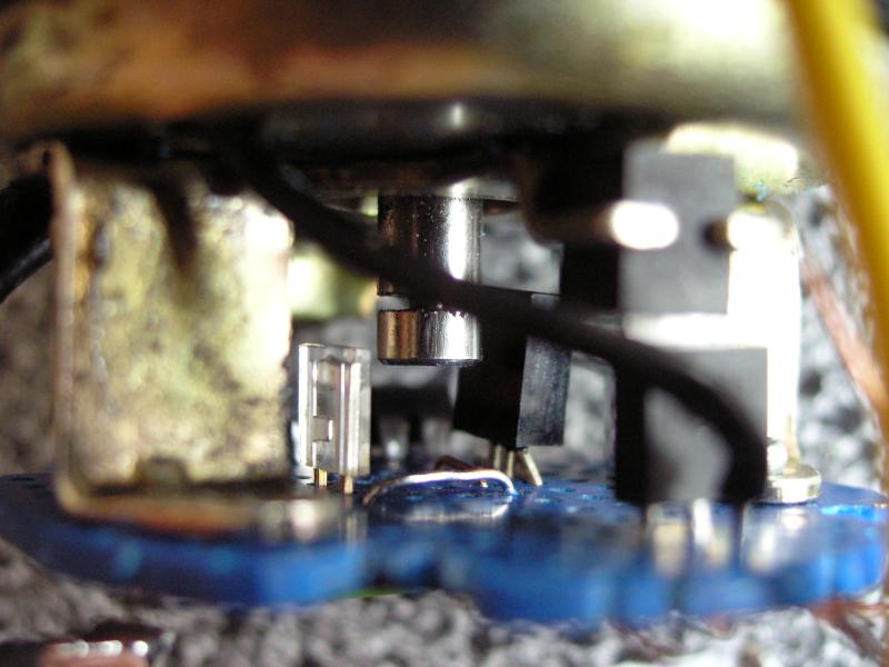 | foto van de lichtsluis met daartussen de as van de pomp. Het sluisje bestaat uit 2 losse componenten. Het geheel is later wel met epoxy gefixeerd, anders zou het stukrammelen. |