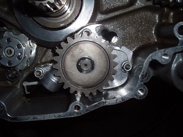 Foto 1 is het binnenwerk van de oliepomp als de deksel is verwijderd. Foto 2 is na montage van de nieuwe deksel, het tandwiel wat op de as zit, alsmede het circlipje.