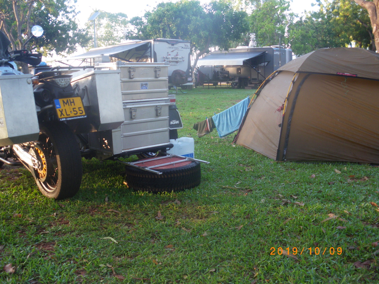 Een wat langere etappe vandaag, 310km. Vanwege de hitte starten we steeds rond 7:00u en stoppen om 10:30u. Omdat we nu Darwin naderen wordt het door de oceaan iets minder heet. Dat is dus 36ºC inplaats van 40ºC. Nog steeds niet koel maar wel wat beter te verdragen. We hebben een camping uitgekozen 10km noord van Darwin. De campings rond Darwin liggen allemaal in de omgeving van het vliegveld, dus dat is niet zo’n goed idee. Ook hier een erg lege camping. Het seizoen is duidelijk voorbij, maar niet voor steekmuggen. Deet werkt.