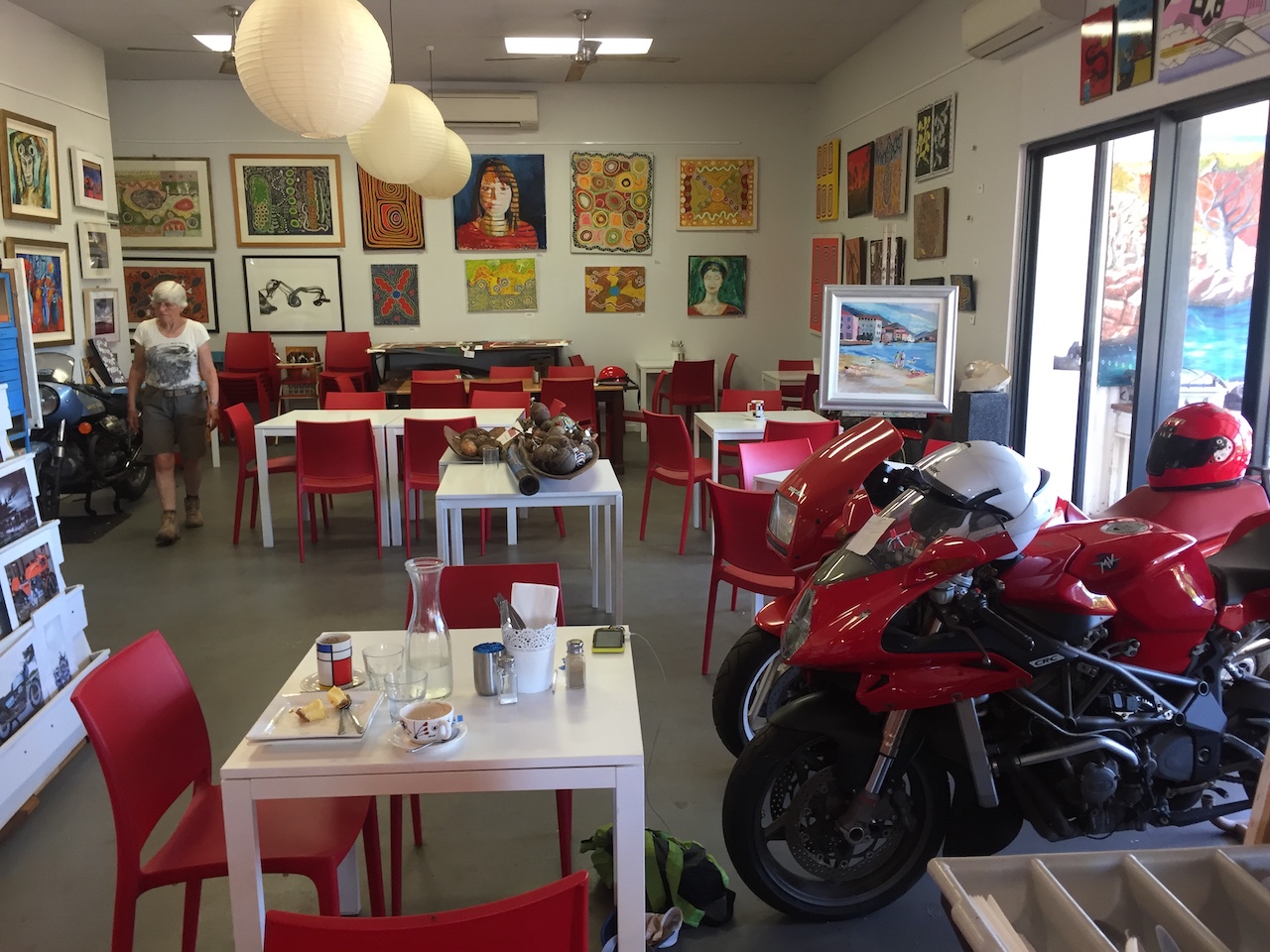 Als we in Jila Gallery Cafe binnen gaan staan er tussen de tafels 4 Italiaanse motorfietsen. Een MV Agusta F4, een Ducati Paso 906, een Moto Guzze 850 Le mans en een Moto Guzze 1000 le mans. Vanavond hier maar eens gaan eten, wordt dan ook Italiaans dus.