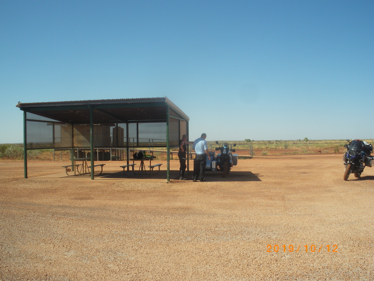 Op weg naar de camping in Halls Creek. Onderweg op een rustplaats ontmoeten we een Australische BMW-rijder. Hij vindt onze combinatie prachtig en fotografeert hem vanuit alle hoeken.