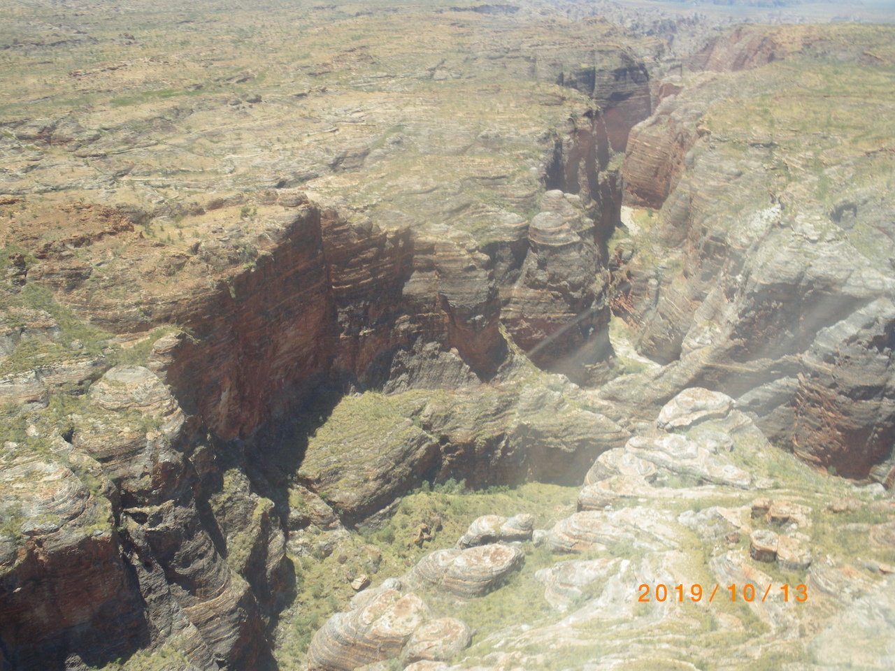 We zijn om 9:00u bij Warmun Roadhouse Caravanpark. Daar is een kantoortje van HeliSpirit waar we direct naar binnen gaan. De piloot die er de administratie zit te doen vertelt dat de beste tijd ’s morgens om 6 uur is. Dan is het nog niet al te warm en is de belichting het mooist. Wij willen graag vroeg de weg op dus hebben we meer voorkeur voor een ander tijdstip. Het kan ook direct al. We besluiten eerst in te schrijven bij de camping, onze tent op te zetten en om te kleden. Daarna willen we wel een vlucht over de Bungle Bungle’s (een deel van het Purnululu National Park) maken. Om 10:30 staan we weer in het kantoor en krijgen we de voorbereiding op de vlucht. Eerst wijst de piloot (Christan) op de kaart aan hoe hij gaat vliegen. Daarna de veiligheidsinstructies. We moeten “plenty of water” mee nemen (dat blijkt 1 flesje van 600ml te zijn). De hele rondvlucht over de Bungle Bungle’s duurt 45 minuten en we zien bergwanden, kloven en watervallen van het park die anders niet bereikbaar zijn. Een mooie ervaring voor een eerste keer in een helikopter.