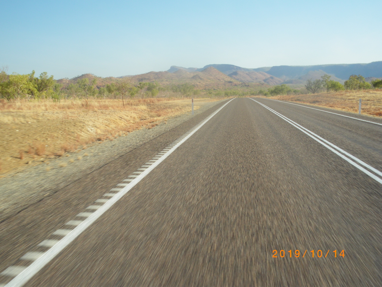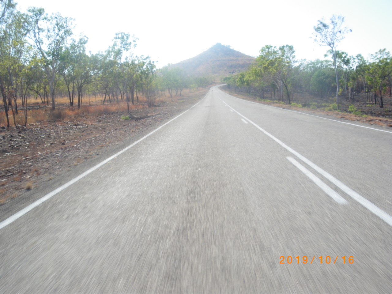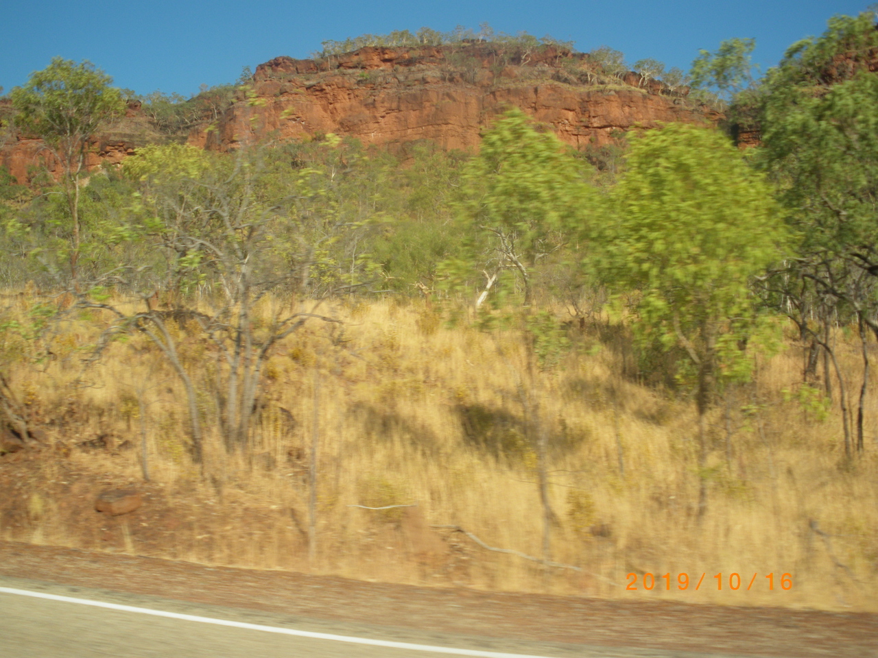 De heuvels in dit deel van Australië blijven prachtig om doorheen te rijden. Veel rotswanden maar ook vlakke stukken. Er zijn hier veel natuurbranden geweest, soms zo recent dat de brandlucht nog aanwezig is. We zijn op weg naar Katherine. We rijden door het dal van Victoria River. Soms te zien, maar vaak niet door de begroeiing.