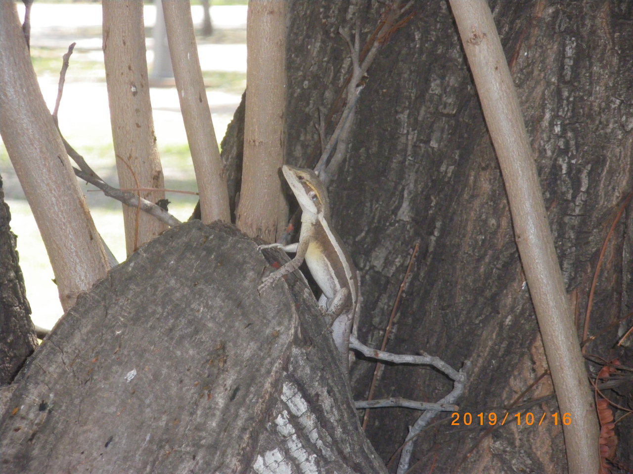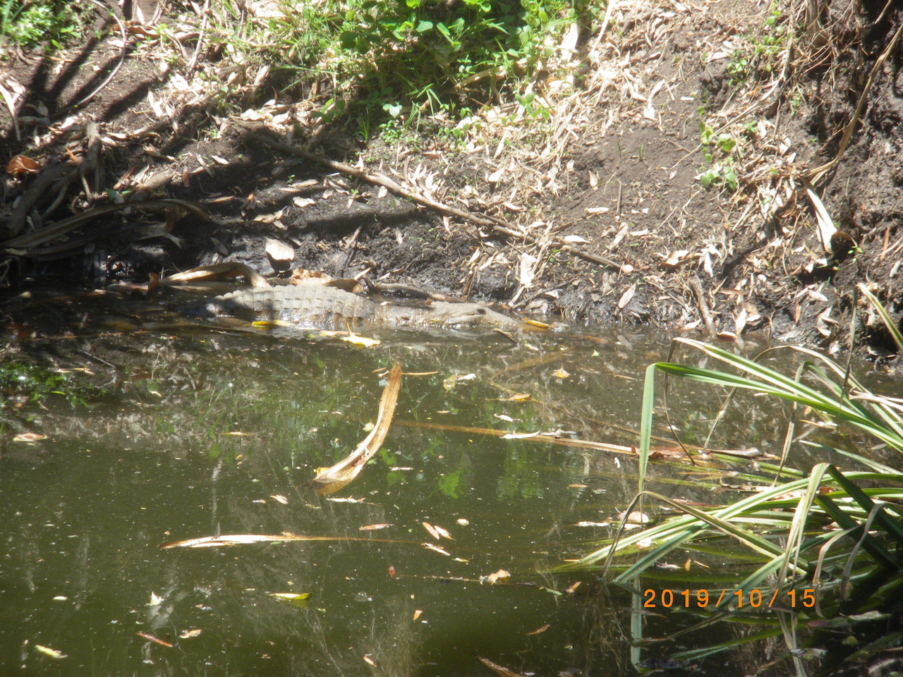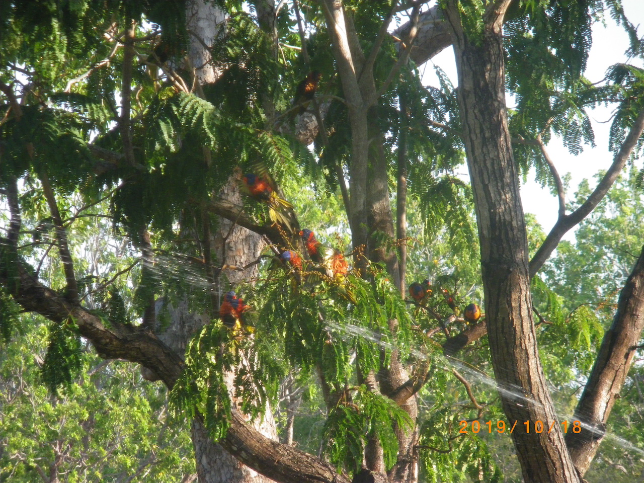 Achter de camping is Timber Creek. Een kreek met inderdaad veel bomen langs. In de kreek leven zoetwater krokodillen. Een kleine soort die (mits met rust gelaten) voor mensen niet gevaarlijk is. Ze leven van kleine dieren en een mens kan hooguit een (fikse) beet krijgen als die vervelend doet. In de bomen is het een gekwinkeleer van je welste van allerlei vogels in allerlei formaten. De Little Friarbird en de Peacefull Pidgeon, Willie Wagtail is er ook weer en boven de kreek hangen fruit-vleermuizen. ’s middags zit er op het gras een hele zwerm groen-geel-blauwe papegaaien.