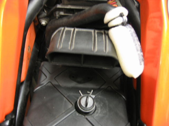 Zo kreeg ik hem terug van de grote beurt, filterkast afgedopt, en uiteinde van de slag voorzien van een "condoom" ( twin air filtertje).
