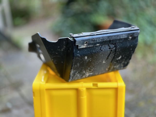 Hij is gebruikt waar hij voor bedoeld is, dus hij draagt de nodige gebruikssporen. Die meteen bewijzen hoe degelijk deze beschermer is. Spuitbusje zwart en hij is weer als nieuw.