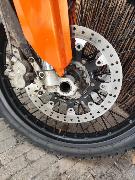 Ooit, lang geleden, toen de KTM nog niet al te lang in mijn bezit was, heb ik ook eens van die klodden gehad met de originele schijven. Gelijk hoe ik ze monteerde, ik had een tremor in het remhendel. Zelfs met 2dehandse hielp het niet.