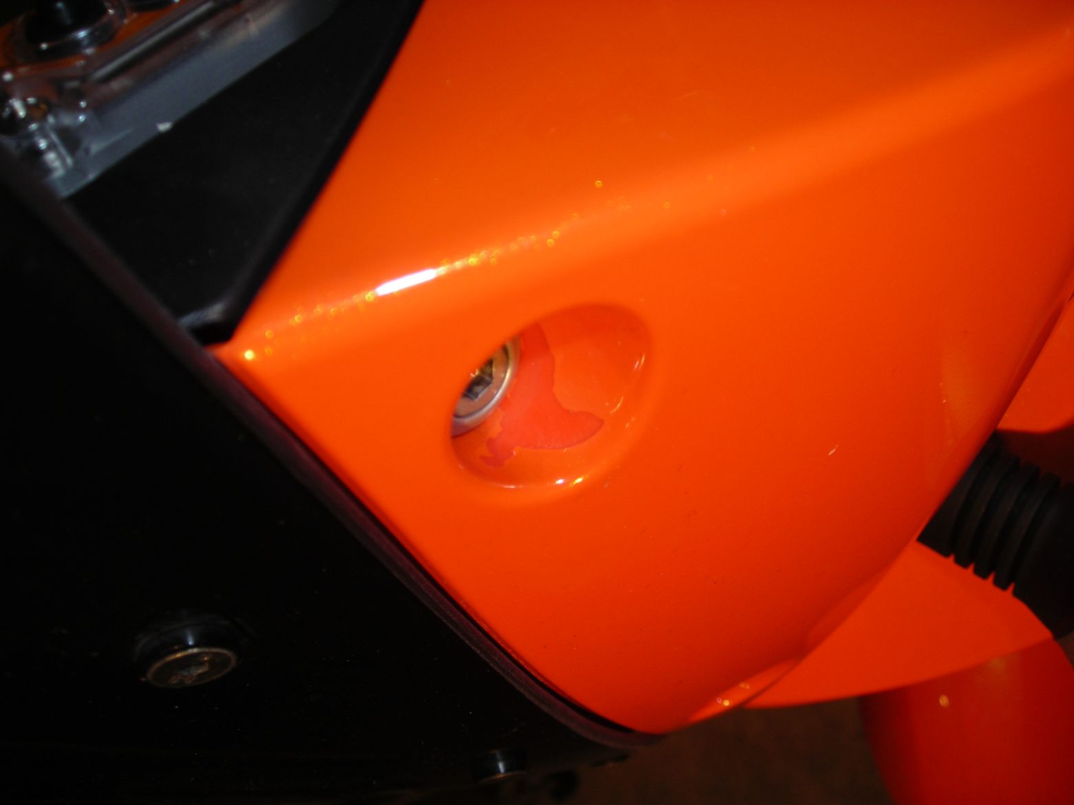ik zit verdomme sinds vandaag met hetzelfde probleem. 'k heb de KTM voor 't eerst gewassen na enkele veldwegritjes en nu blijkt midden op het linker middenpanneel een stuk van 1 op 2 cm te mankeren !