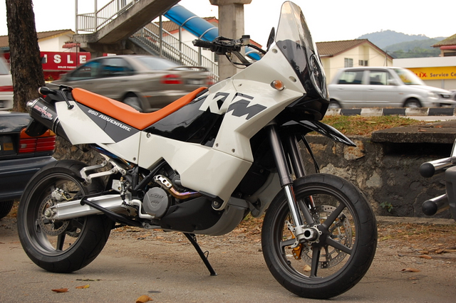 tsja, 't is dat mijn KTM Adventure met 16-tands voortandwiel al meer dan genoeg op een botsbal lijkt. Vandaag in de regen heb ik me zitten amuseren met het zijwaarts laten uitbreken van mijn achterwiel. Just for fun. Dus moest ik 17"-velgen monteren, wel, ik vrees dat ik dan na een paar ritten rijp ga zijn voor het zothuis.
