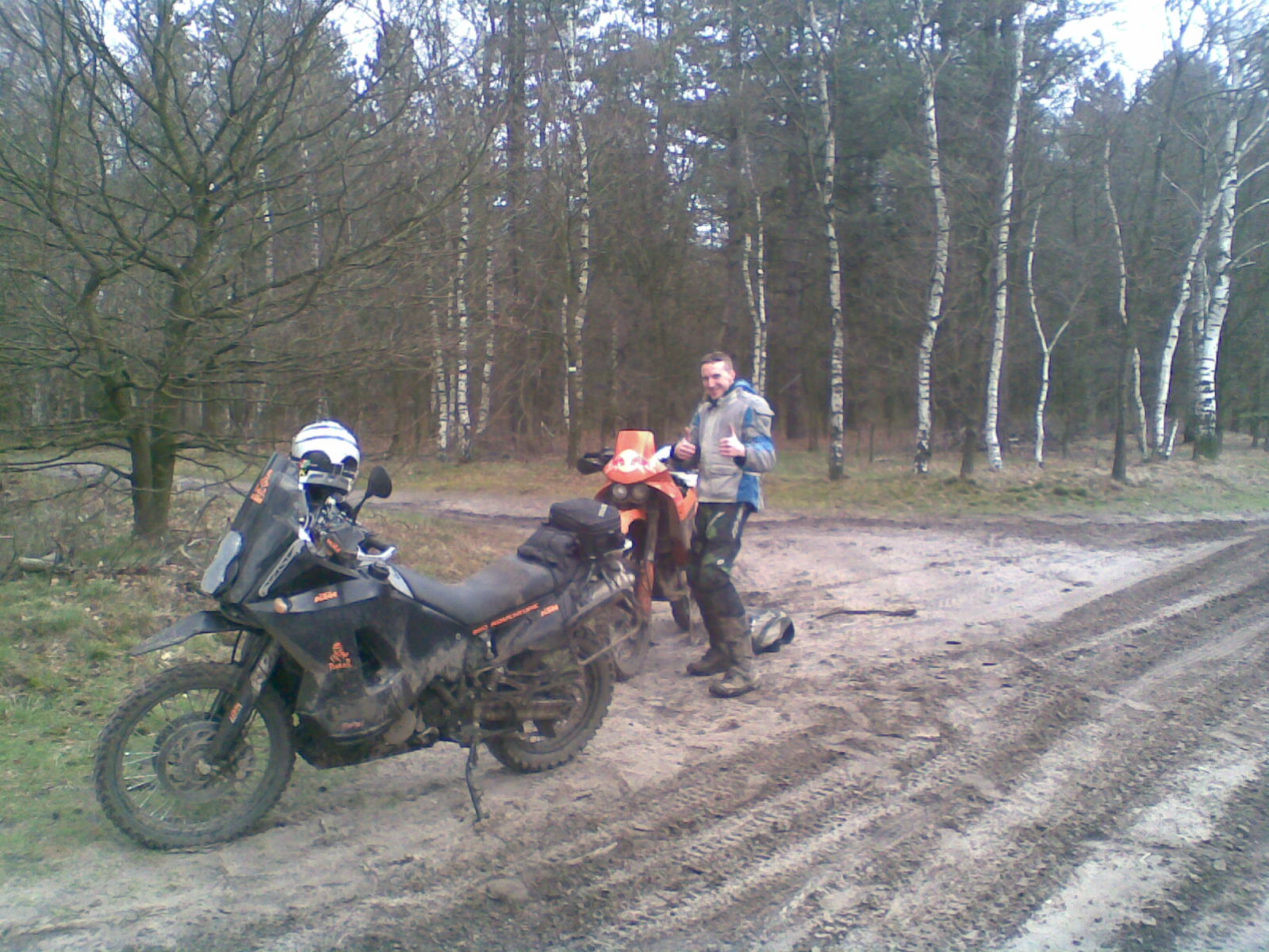Het viel me inderdaad op dat er weinig zware jongens waren. Ik had me ingeschreven voor de 210 km rit. Meer naiviteit van me denk ik. stars Maar ok.. We gingen er voor. Af en toe modderpaden bij van 1 km lang. Degene die hem gereden hebben zullen wel weten waar ik over praat. Glibber de glibber..Bijna niet te rijden. Ikke 3 keer op mijn snufferd gegaan. Waarvan 2 maal door vemoeidheid. 1 wil ik jullie niet onthouden. Er stond namelijk een visserstent midden op een pad waar de route over liep en de vissers al zuur kijken omdat er 2 crossers aankwamen. Je mag raden waar ik viel... Ja hoor.. Midden in de tent van de vissers laugh Gelukkig niets aan de tent. Maar wel aan mijn ego laugh laugh