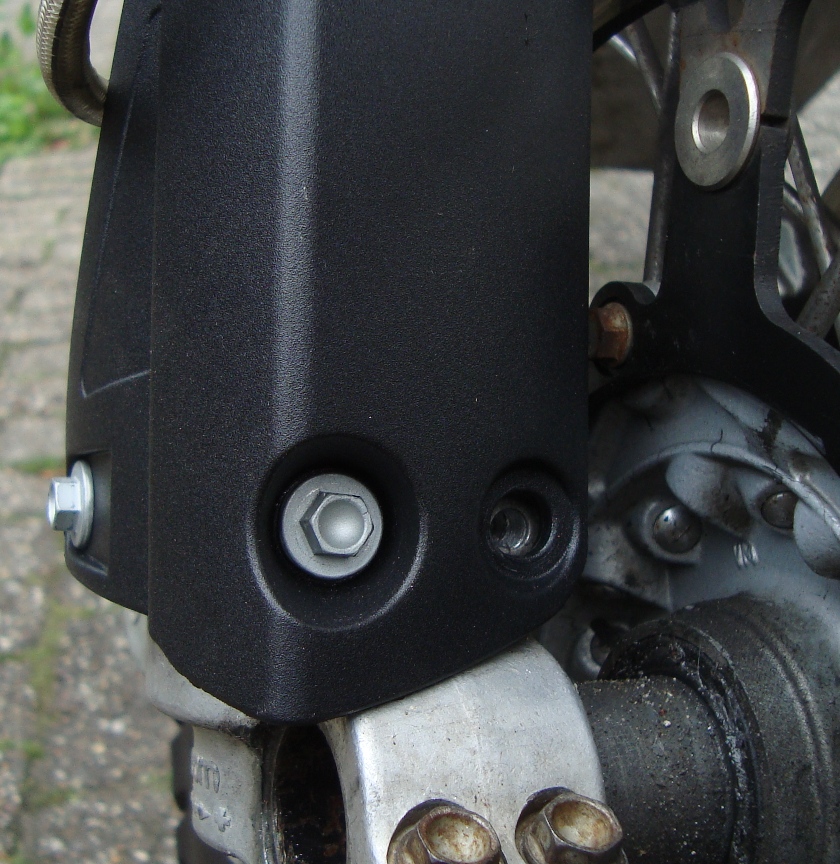 Momenteel zit mijn vorkpoot plastic met 2 boutjes vast waarvan ik er 1 ook niet helemaal vertrouw, deze schroefdraad is ook danig beschadigd door de verkeerde bouten.