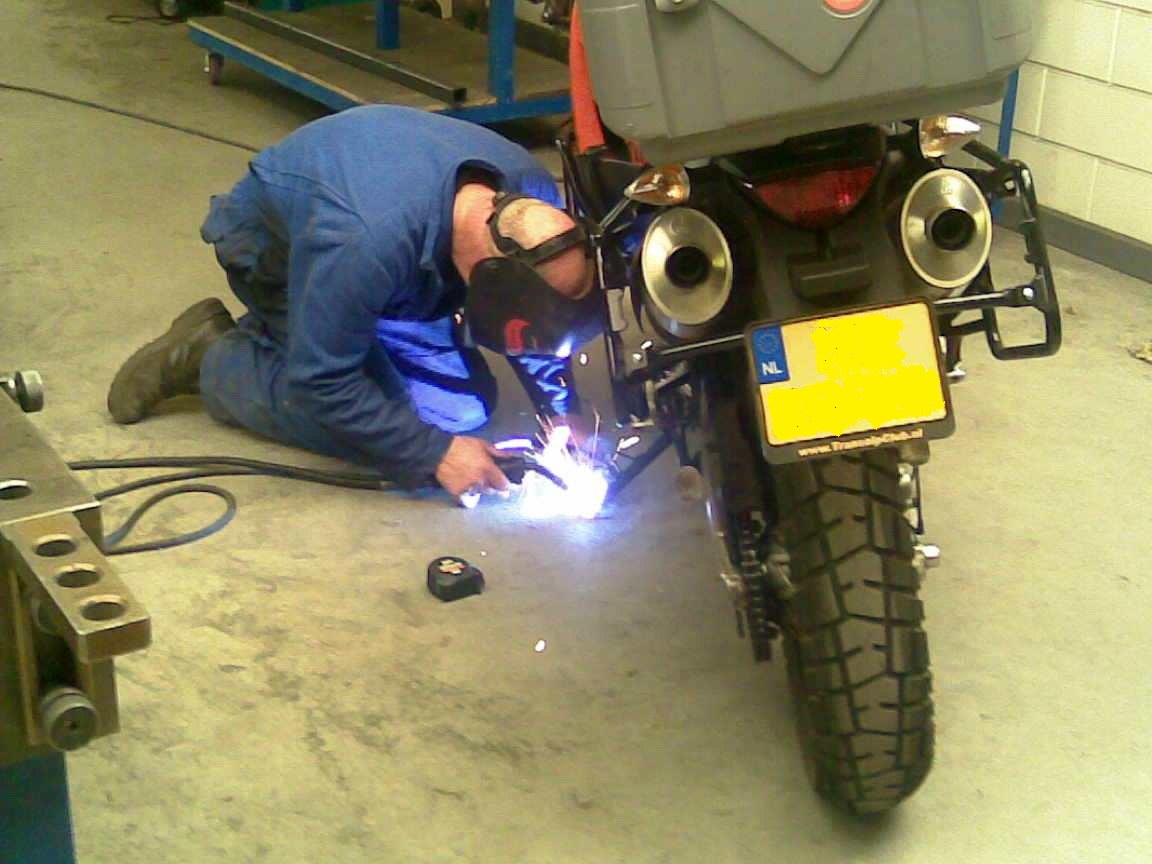 Ik geeft toe dat ik een goede relatie heb met deze vakman en dat hij ervaring had opgedaan met mijn vorige stalen ros, een XRV 750. Het plaatje dat hij uit de restjesbak haalde is ong. 40X40X5 mm. Het lassen is gedaan met professionele apparatuur. Nabehandeling met grondverf en Hammerite uit een spuitbus. Is naar mijn bescheiden mening mooier dan een after-market ding van bijv. Touratech lipsrsealed