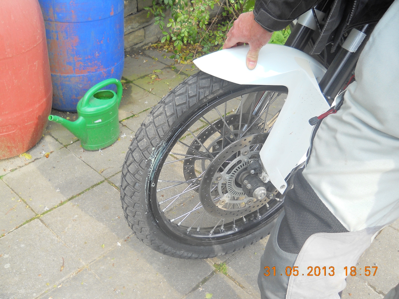 Vrijdagnamiddag vertrokken we (ikzelf met vrouwtje, mijn vaste "GS"-motormaat, en nog een ander koppel) gepakt en gezakt richting Spa voor ons Ardens off-roadavontuur van zaterdag (2de GS-Trail de Belgique-editie). Ik reed voor, het zonnetje was van de partij en het ging goed vooruit. Alleszins tot ergens in Comblain-au-Pont op een mooi bochtig baantje waar er plots een rots"steentje" op de weg lag.... vlak op mijn rijlijn. Ik zag het object wel liggen, dacht stukske hout.... dus gene paniek. Te dicht om nog veilig te ontwijken (ong.90 km/u), erop en erover met het voorwiel. Hoorde klop (op velg), steen dus... Direct niets abnormaals tot na enkele seconden de voorband (binnenband) klapte. Ineens plat tot op de velg. Moto begon te zwalpen van links naar rechts. Zeker wel 15 keer weg en weer gezwalpt, telkens aan 't vechten om alles recht te houden, (geladen met zij- en topkoffers en met Patricia achter op.....) Dikke pluim voor mijn vrouwke, klampte zich als een blok beton aan mij vast.