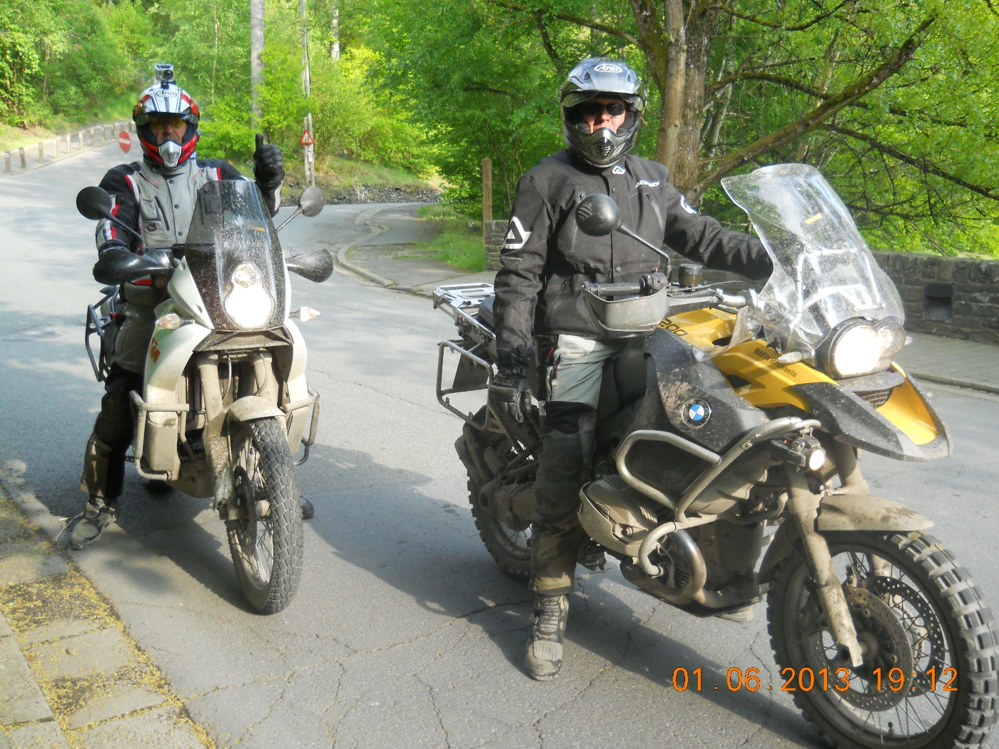 KTM (europ)-assistance gebeld, moto weggetakeld, wij met bagage in taxi naar hotel, 's nachts niet geslapen, zaterdagmorgen moto afgeleverd bij BMW garage in Verviers van waar onze off-road tocht startte, binnenband vervangen bij BMW-dealer (23 euro) velg licht geraakt maar niet alarmerend, dus zo gelaten en om 9u45 den dezen zo blij als een klein kind klaar voor de start!!!