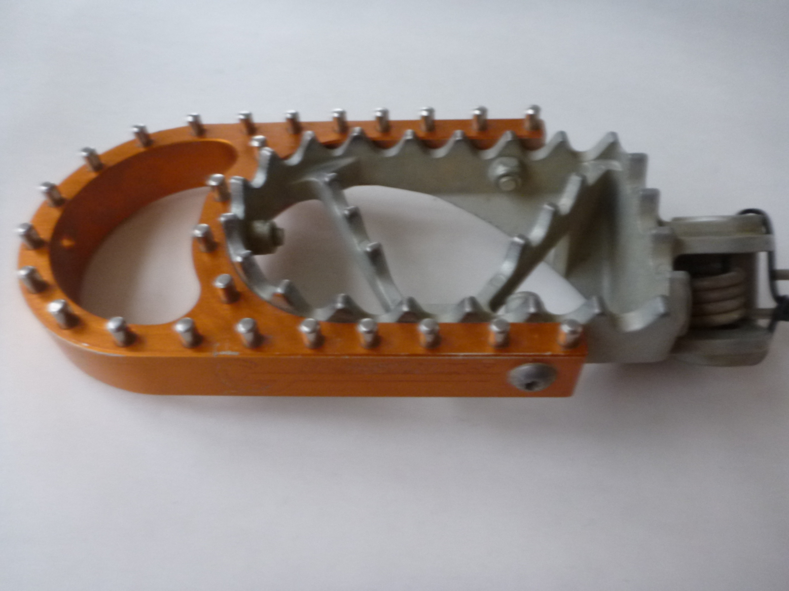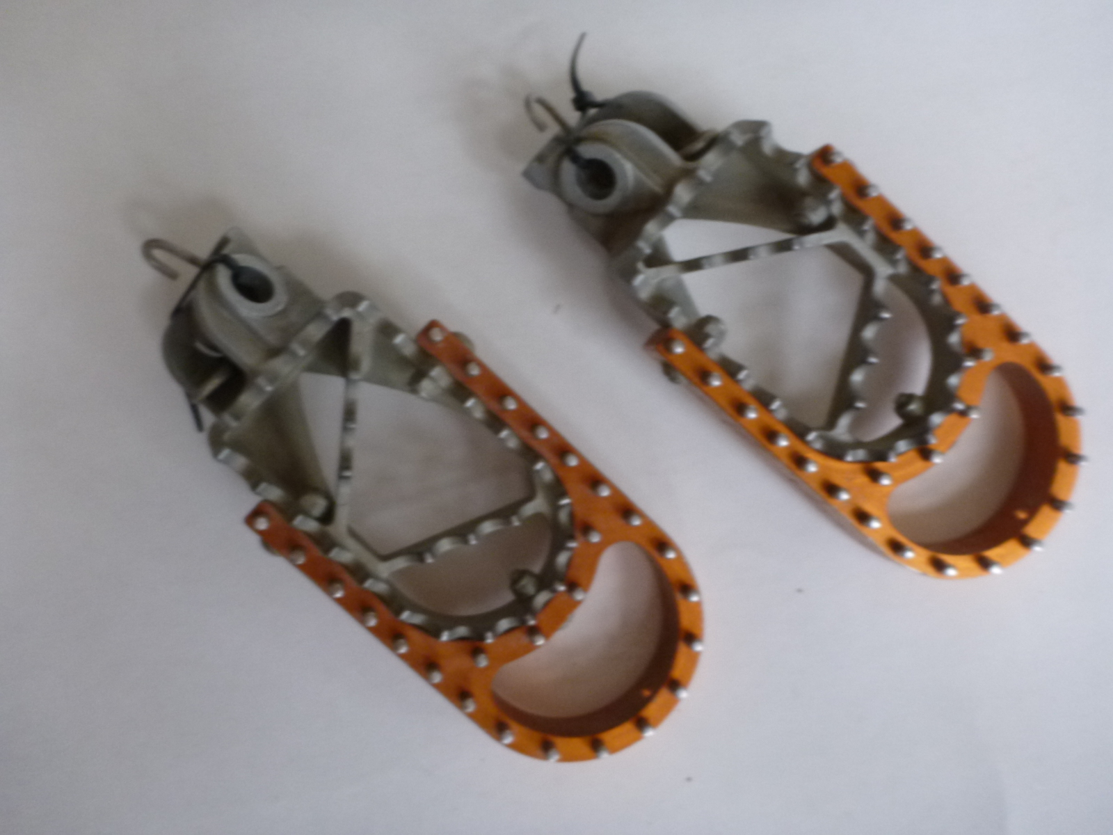 CJ Designs maakt deze verbreders in 2 maten, dit is de large (dus meest brede) uitvoering. Ze zijn van gefreesd aluminium en oranje geanodiseerd. Er zitten wat kleine krasjes op (off road… )maar verder 100% in orde. Ik verkoop ze omdat ik nu met verlaagde voetsteunen rij.